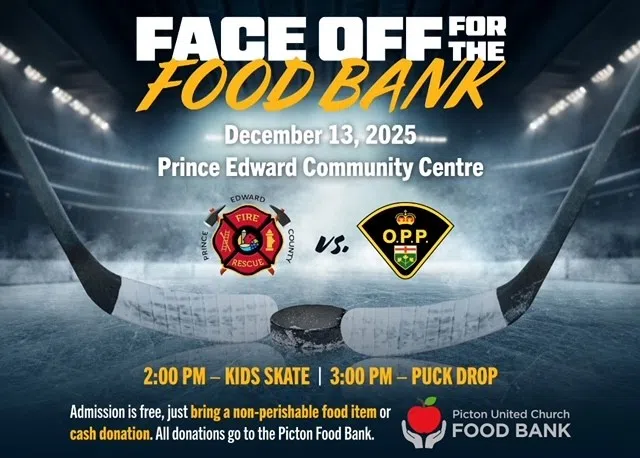 The Face Off for the Food Bank charity hockey game will take place this afternoon for 3pm in Picton at the Prince Edward Community Centre (375 Picton Main St). Prince Edward County Fire & Rescue a...