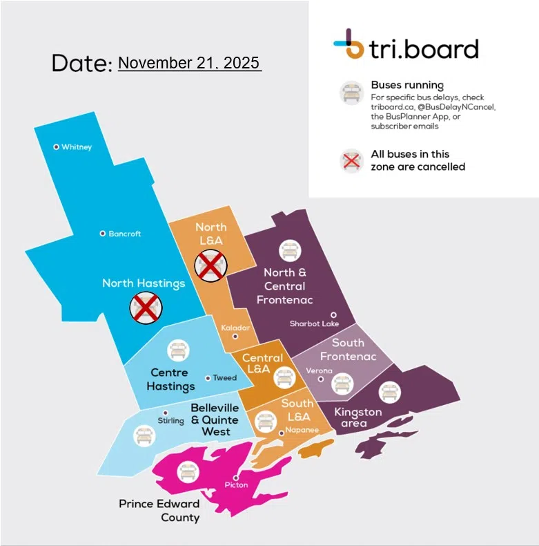 Due to freezing rain received overnight, transportation is cancelled in Tri-Board’s North Hastings and North Lennox & Addington weather zones today.