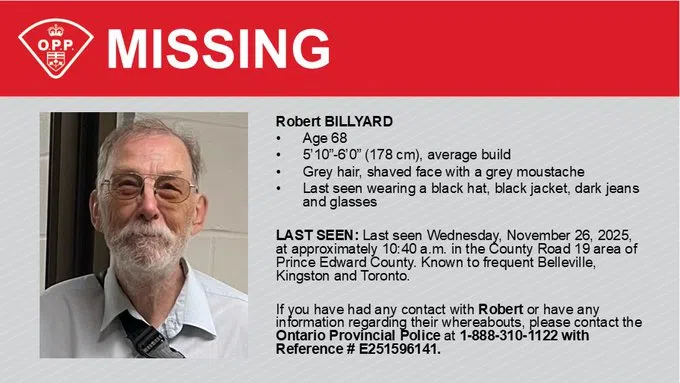 Prince Edward OPP is seeking assistance in locating missing 68-year-old Robert Billyard, who officials say was last seen Wednesday, November 26 at approximately 10:40 a.m. in the County Road 19 area of Prince Edward County.