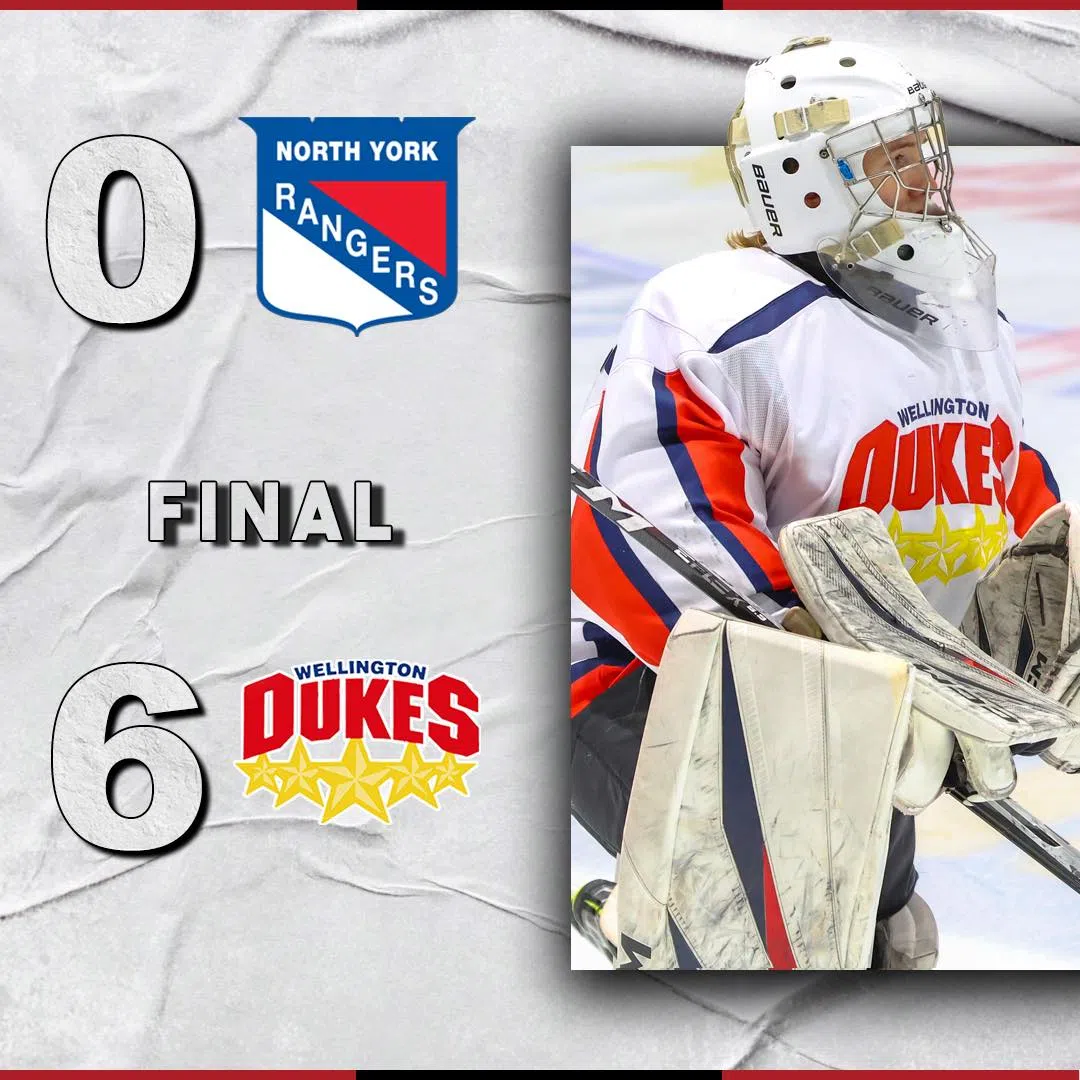 The Wellington Dukes blew their Tuesday afternoon affair open with four third period goals in a 6-0 rout of the North York Rangers.